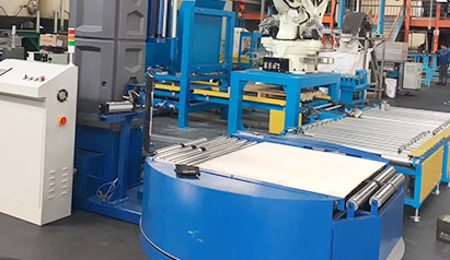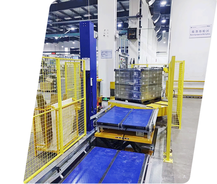 基于現階段市場需求新開發的一款配套流水線的全自動纏繞包裝機,自動包裝整線方案:自動封箱機+自動纏繞機+碼垛機+AGV移動車+立體庫。